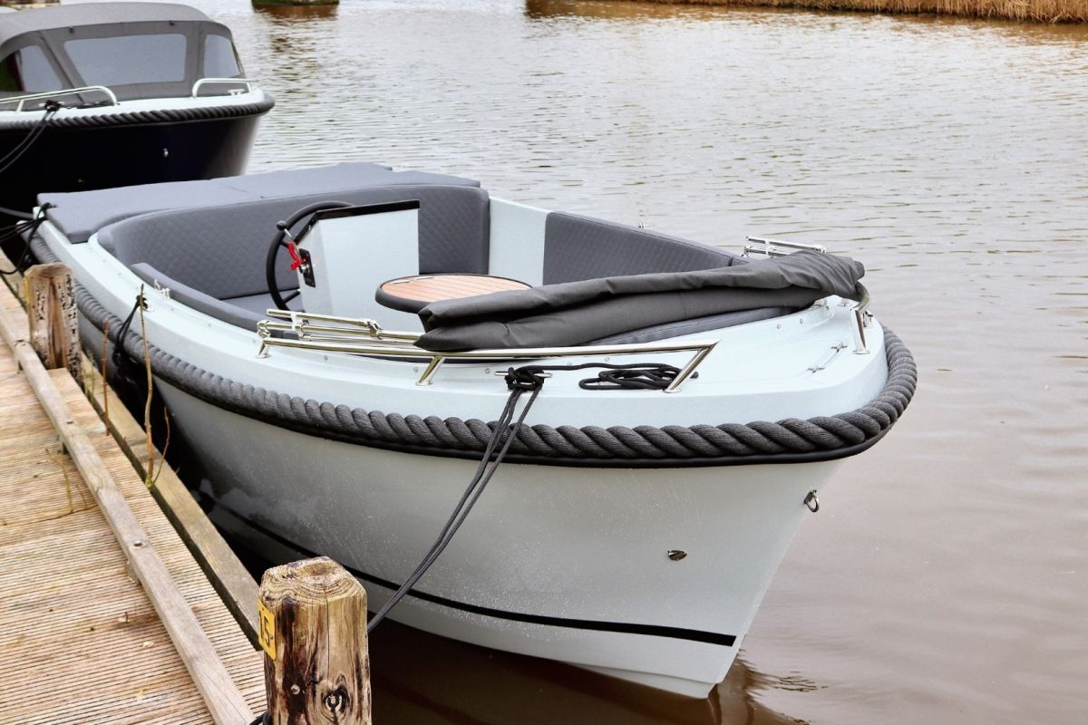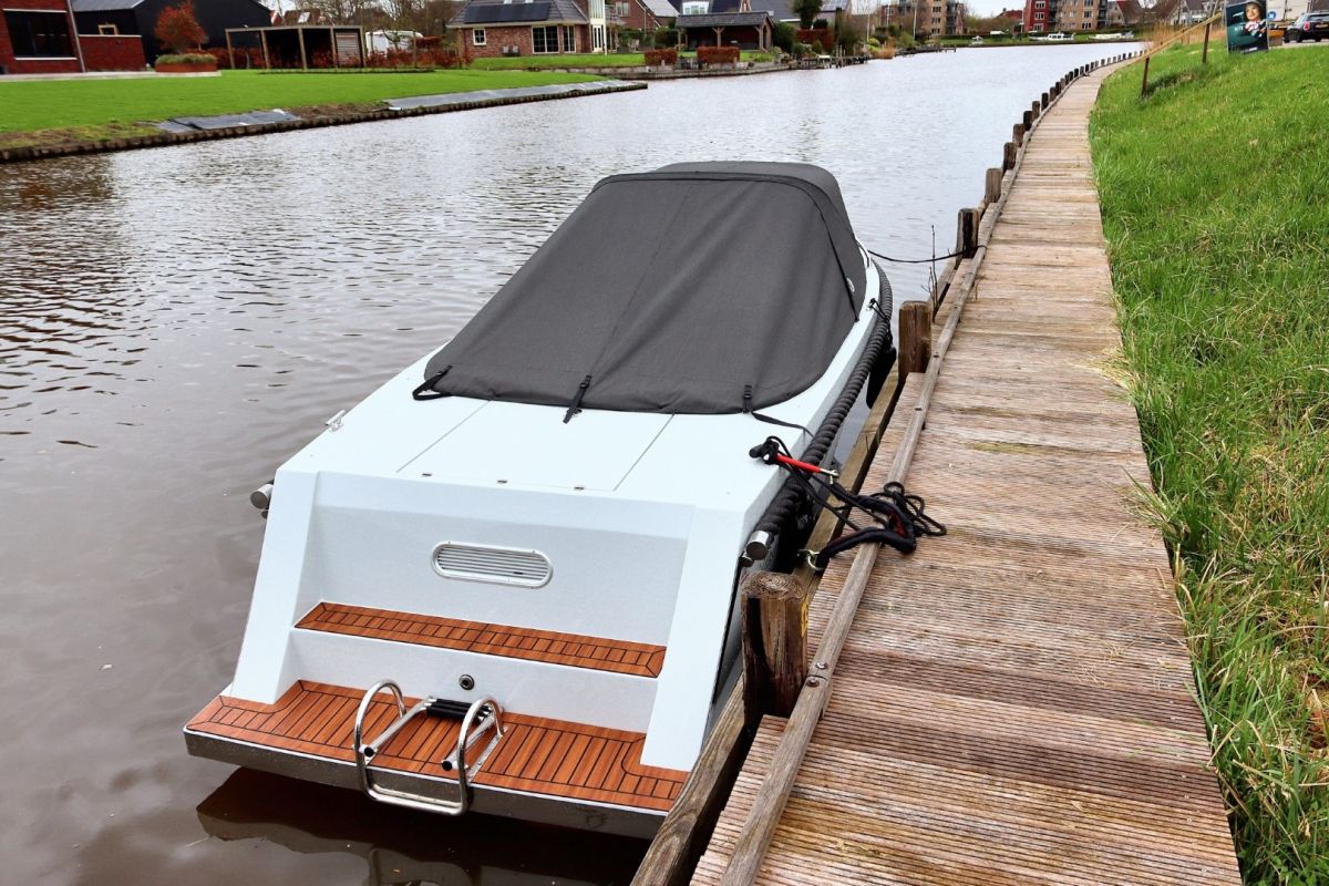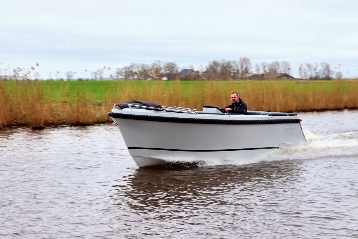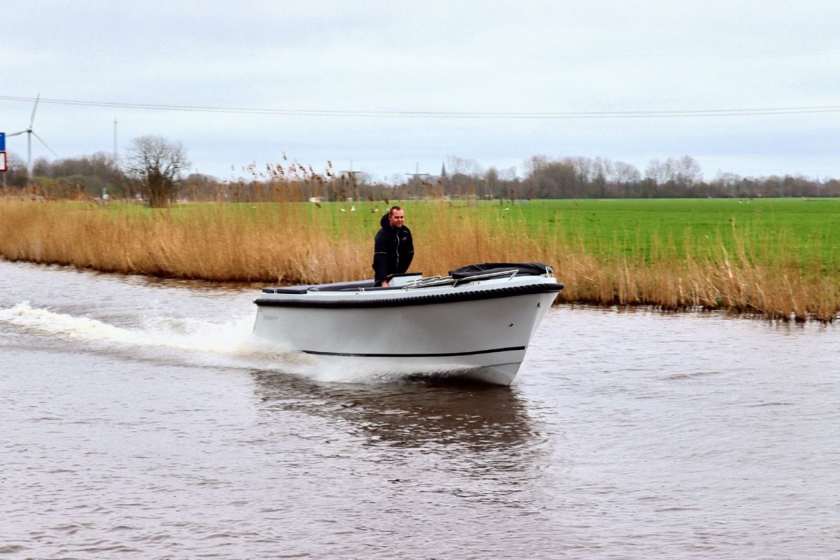 Deze tendersloep vaart stabiel en voorspelbaar, waardoor hij prettig aanvoelt op zowel rustig binnenwater als grotere plassen. De motor wordt netjes in bun geplaatst, wat zorgt voor een strakke uitstraling én stiller varen.